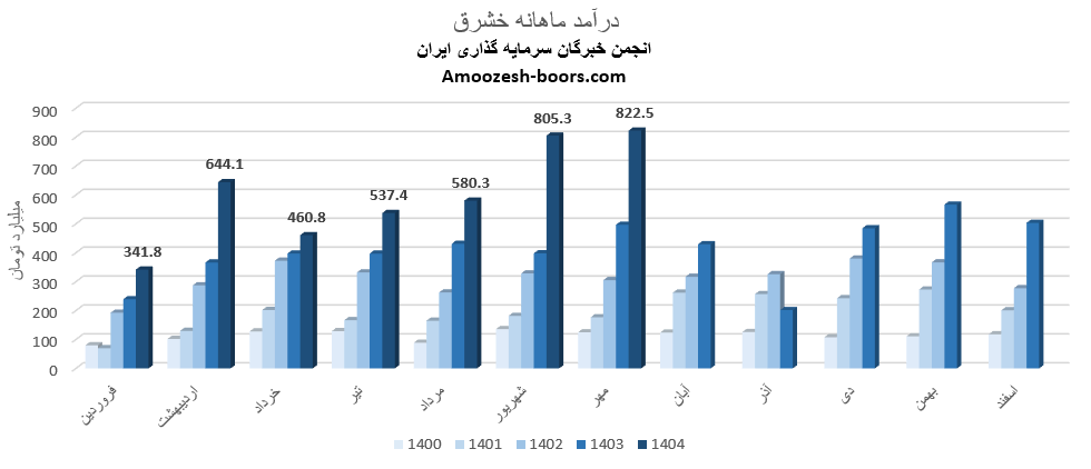 سهام خشرق از ابتدای سال مالی تا پایان شهریور 1404، به درآمد 3370 میلیارد تومان رسیده که نسبت به مدت مشابه سال گذشته 51 درصد رشد داشته، و در همین حال 69 درصد از کل درآمد سال گذشته تحقق یافته است.