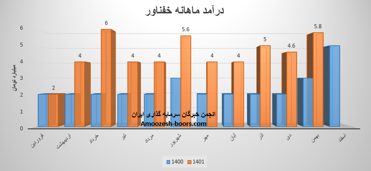 نماد خفناور که در بهمن ماه با ثبت گزارش مطلوبی به درآمد 5.8 میلیارد تومان رسید، موفق به افزایش 26 درصدی درآمد نسبت به ماه گذشته و همچنین افزایش 34 درصدی نسبت به متوسط ماهانه و 93 درصدی نسبت به مدت مشابه گردیده است، مجموف درآمد خفناور در عملکرد تجمیعی 11 ماهه رشد 110 درصدی نسبت به مدت مشابه داشته است، پر فروش ترین محصول سهم خفناور شاتون پژو با سهم 43 درصدی از فروش ماهانه گزارش شده است این در حالی است که در ماه گذشته تولید و فروشی از این محصول انجام نشده بود.