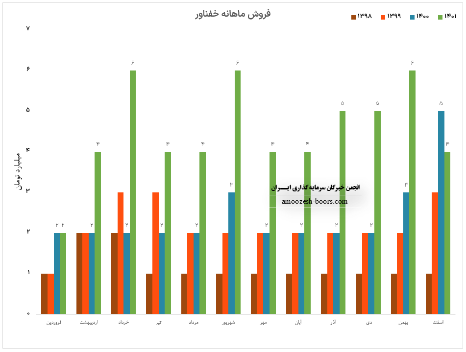سهم خفناور در اسفند ماه حدود بیش از 46/200 قطعه از محصولات خود را به فروش رسانده که این میزان در مقایسه با حجم فروش ماه گذشته 27 درصد افت پیدا کرده است