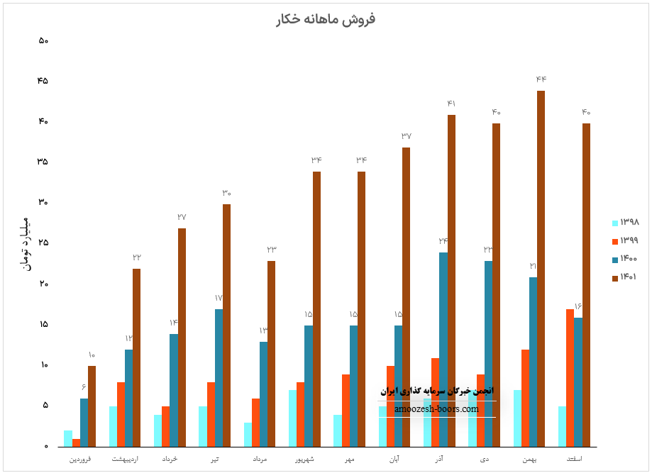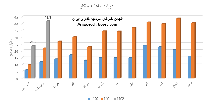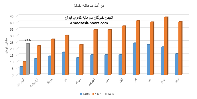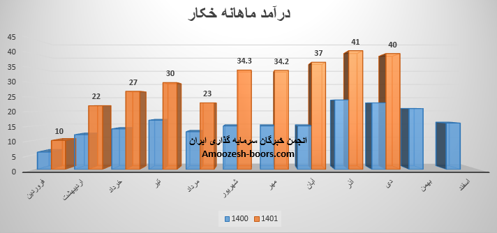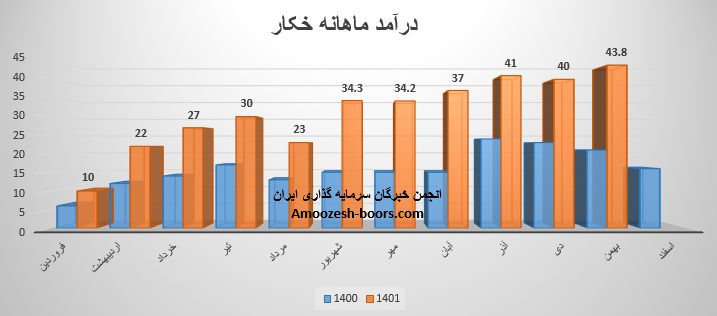 روند صعودی در گزارشات ماهانه نماد خکار ادامه داشته و به درآمد 43.8 میلیارد تومانی رسیده است، درآمد بهمن ماه سهم خکار تغییرات زیر را تجربه نموده است؛