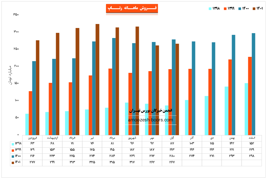 نماد رتاپ (شرکت تجارت الکترونیک پارسیان) در آذر ماه ۱۴۰1 حدود مبلغ 278 میلیارد تومان درآمد داشته که این میزان در مقایسه با ماه گذشته 4% و همچنین در مقایسه با مدت مشابه سال گذشته 1% رشد پیدا کرده است.