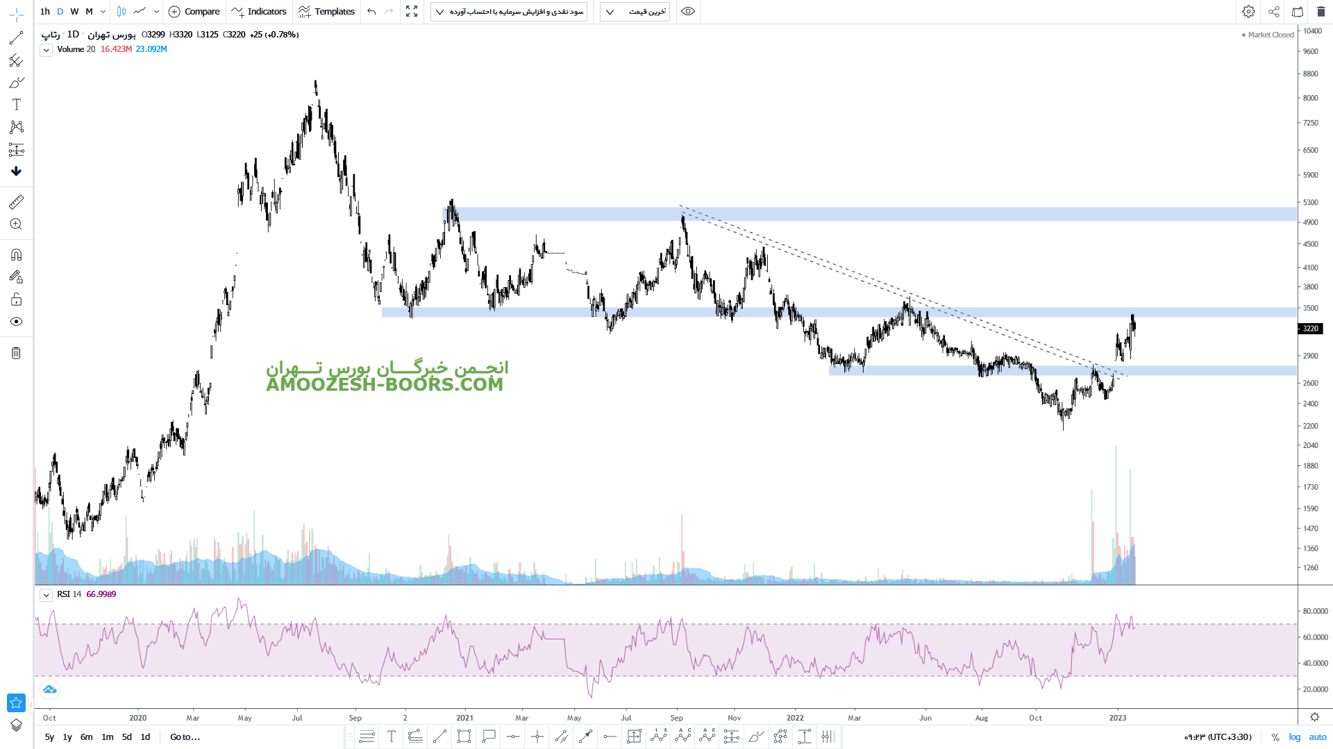 قیمت سهم رتاپ پس از تبدیل مقاومت ناحیه ۲۷۵ تومان به حمایت رشد خود را تا ناحیه مقاومتی ۳۵۰ تومان ادامه داده و اکنون نیز میتواند در صورت شکست این ناحیه مقاومتی، رشد خود را تا ناحیه مقاومتی ۵۱۰ تومان نیز ادامه دهد. همچنین در صورت اصلاح اولین حمایت سهم رتاب ناحیه ۲۷۵ تومان در نظر گرفته شده است.