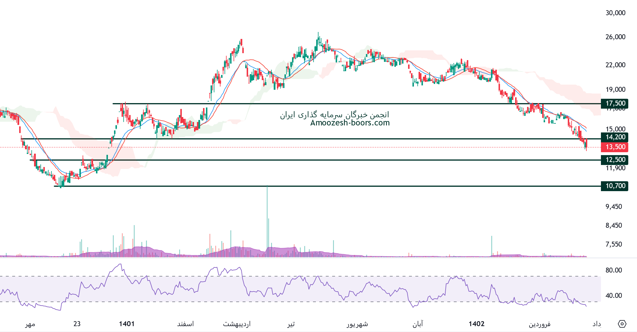 1. حمایت شفا 13400 ریال: این سطح به‌عنوان یک نقطه حیاتی برای جلوگیری از اصلاح بیشتر قیمت عمل می‌کند، اگر قیمت به زیر این سطح نفوذ کند، انتظار می‌رود که حمایت بعدی در محدوده 11500 ریال قرار داشته باشد.