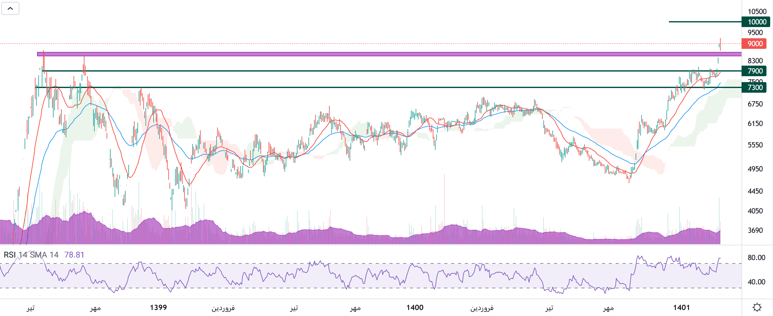 قیمت پس از رشد 70 درصدی ک داشته با فشار فروش مواجه گردیده، در صورت اصلاح، اولین حمایت سهم 7000 ریال در نظر گرفته خواهد شد، همچنین در صورت ادامه دار شدن روند صعودی، حرکت سهم به ترتیب تا 8100 و 8600 ریال محتمل خواهد بود.