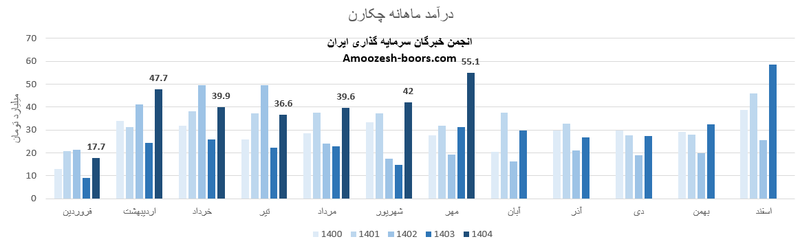 بر اساس گزارش فعالیت سهم چکارن که در کدال منتشر شده، این شرکت در این ماه توانسته به درآمد 42 میلیارد تومان دست یابد، این عدد در مقایسه با ماه گذشته تغییر 6%+، در مقایسه با متوسط ماهانه 13%+ و در مقایسه با مدت مشابه 184%+ داشته است.