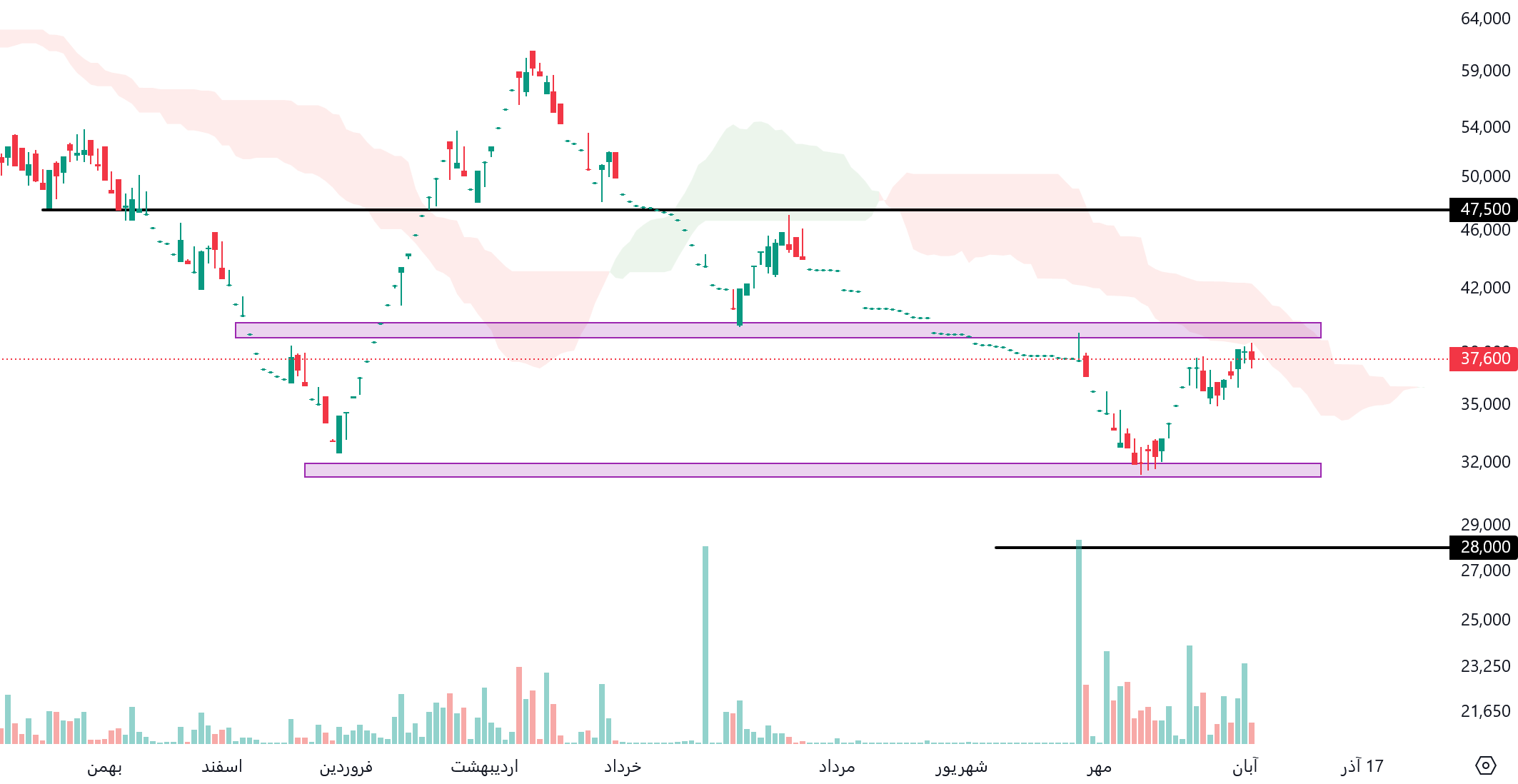 1. حمایت غالبر 45000 ریال: این سطح به‌عنوان یک نقطه حیاتی برای جلوگیری از اصلاح بیشتر قیمت عمل می‌کند، اگر قیمت به زیر این سطح نفوذ کند، انتظار می‌رود که حمایت بعدی در محدوده 37000 ریال قرار داشته باشد.